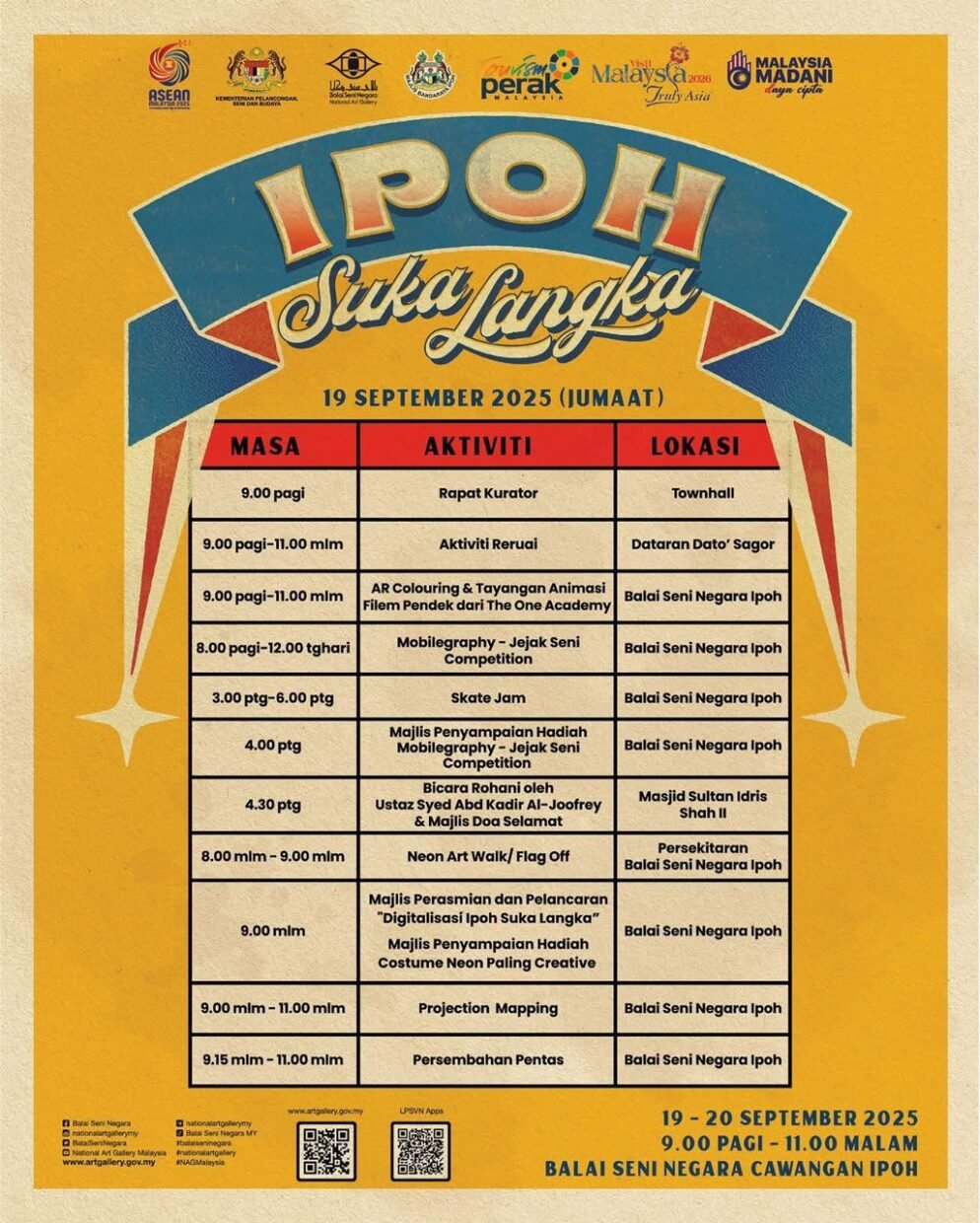 Program akan dirasmikan pada 19 September 2025 (Jumaat) jam 9.00 malam. Majlis turut disertakan dengan pelancaran inisiatif “Digitalisasi Ipoh Suka Langka” dan penyampaian hadiah kepada pemenang bagi “Kostum Neon Paling Kreatif”.