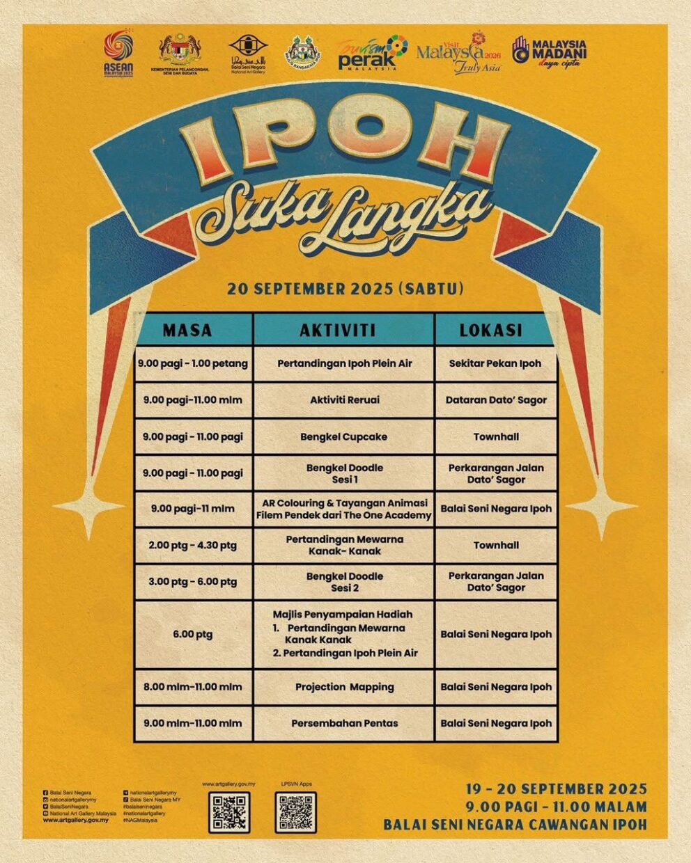 Orang ramai dijemput hadir bagi memeriahkan program ini serta bersama-sama meraikan seni, budaya dan komuniti di bandar raya Ipoh. Maklumat lanjut mengenai jadual pertandingan dan aktiviti, ikuti media sosial rasmi Balai Seni Negara atau layari laman sesawang www.artgallery.gov.my.