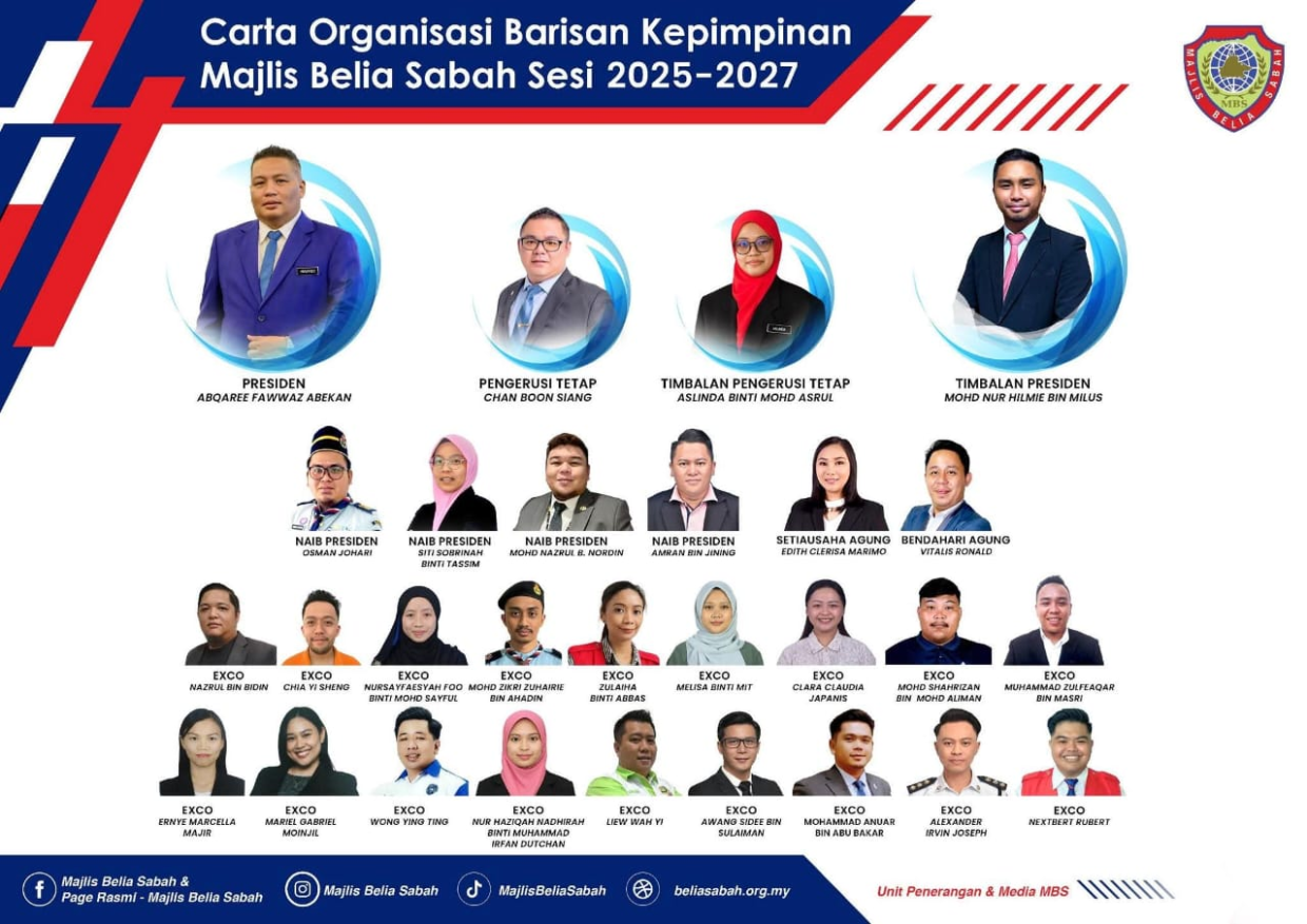 Kota Kinabalu, 2 Januari 2026 – Majlis Belia Sabah (MBS) telah mengumumkan barisan kepimpinan baharu bagi sesi 2025–2027 selepas pilihan raya yang diadakan semasa Mesyuarat Perhimpunan Agung Tahunan (MPAT) Kali Ke-28 pada 30 Disember 2025.
