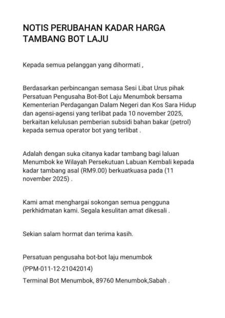 KOTA KINABALU, 11 Nov – Kadar tambang bot penumpang bagi laluan Menumbok-Wilayah Persekutuan Labuan dikembalikan kepada harga asal RM9.00 berkuat kuasa hari ini, susulan muafakat yang dicapai antara Kementerian Perdagangan Dalam Negeri dan Kos Sara Hidup (KPDN) dengan Persatuan Pengusaha Bot-Bot Laju Menumbok.